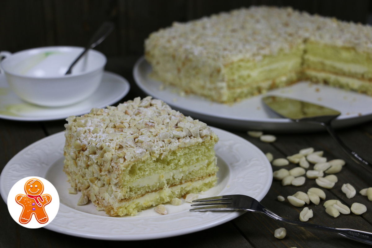 На сервировочную тарелку выкладываем коржи, каждый хорошо пропитываем и смазываем кремом. Завершаем украшением — обсыпаем торт жареным арахисом и посыпаем сахарной пудрой. Даем настояться в холодильнике, чтобы торт пропитался.