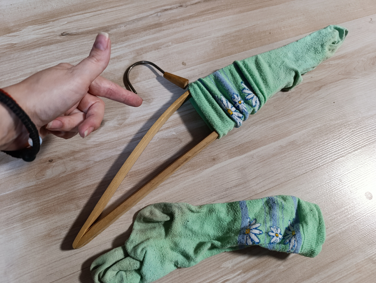 Теперь все максимально просто. Смачиваем носок водой с глицерином — этот ингредиент создаёт невидимую пленку, предотвращающую оседание пыли. Надеваем носок на вешалку и направляем «инструмент» туда, где пыль скапливается в большом количестве — под холодильник, за шкаф или стиральную машину. Удивительно, сколько грязи накопится на вашем носке!