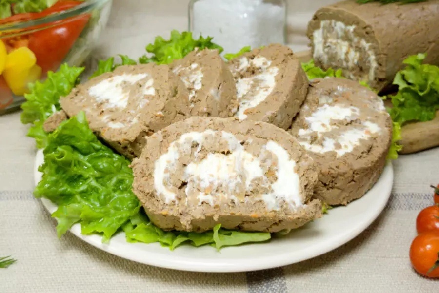 Готовый рулет лучше подавать охлажденным, что поможет сохранить его форму. Блюдо отличается насыщенным вкусом, где нежная печень гармонично сочетается с морковью и луком, а творожный сыр добавляет сливочные нотки. Для разнообразия в начинку можно добавить свежую зелень: укроп, петрушку или кинзу.