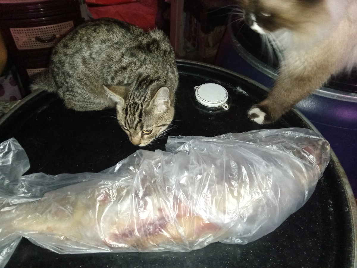 Как только рыба оказывается на столе, домашние любимцы сразу тянутся проверять, что же вызывает такой неожиданный запах. Это прежде всего смущение: кошки и собака скупо обходят стороной, осознавая размер и загадочный холод от рыбины. Однако один из смелых котов по имени Ёжик оказывается первым, кто решается пробовать кету!
