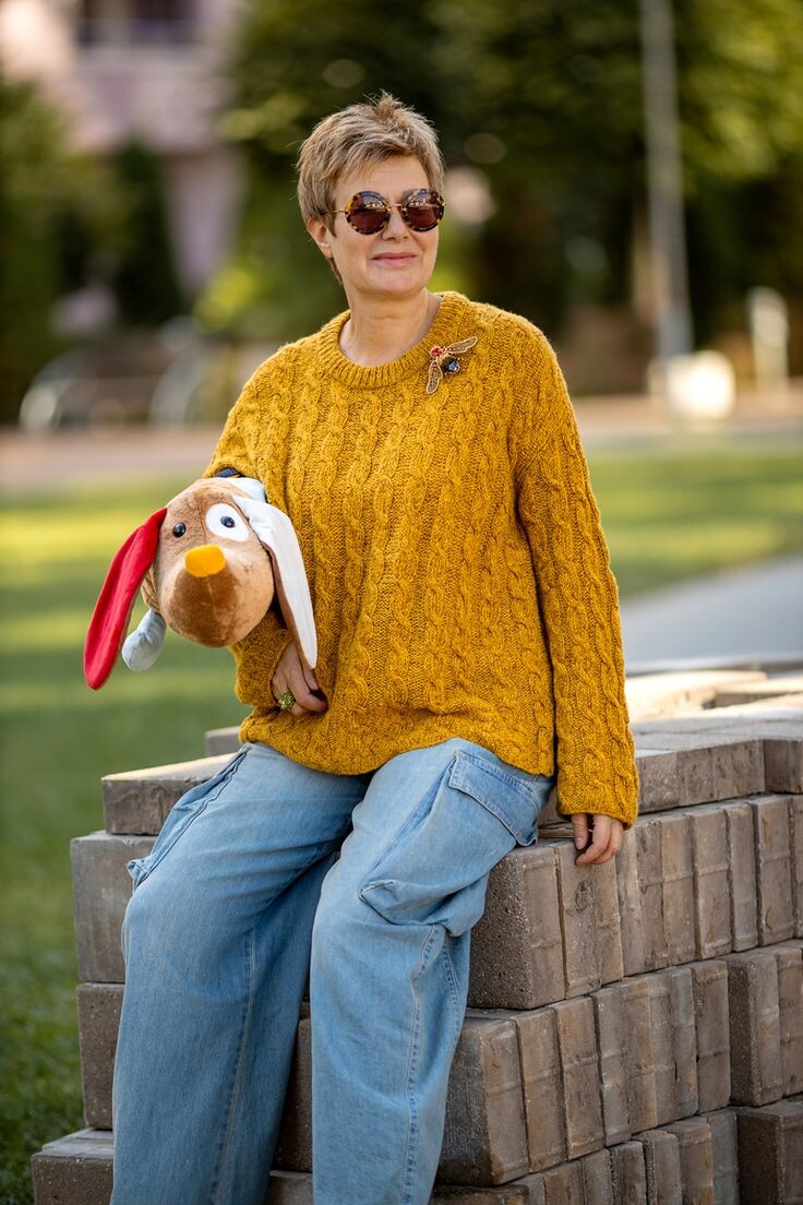 - Свободный джемпер насыщенного горчичного цвета идеально подходит для повседневных комплектов. Лаконичность этой вещи подчеркивает элегантность и позволяет комбинировать ее с джинсами и практичными аксессуарами.