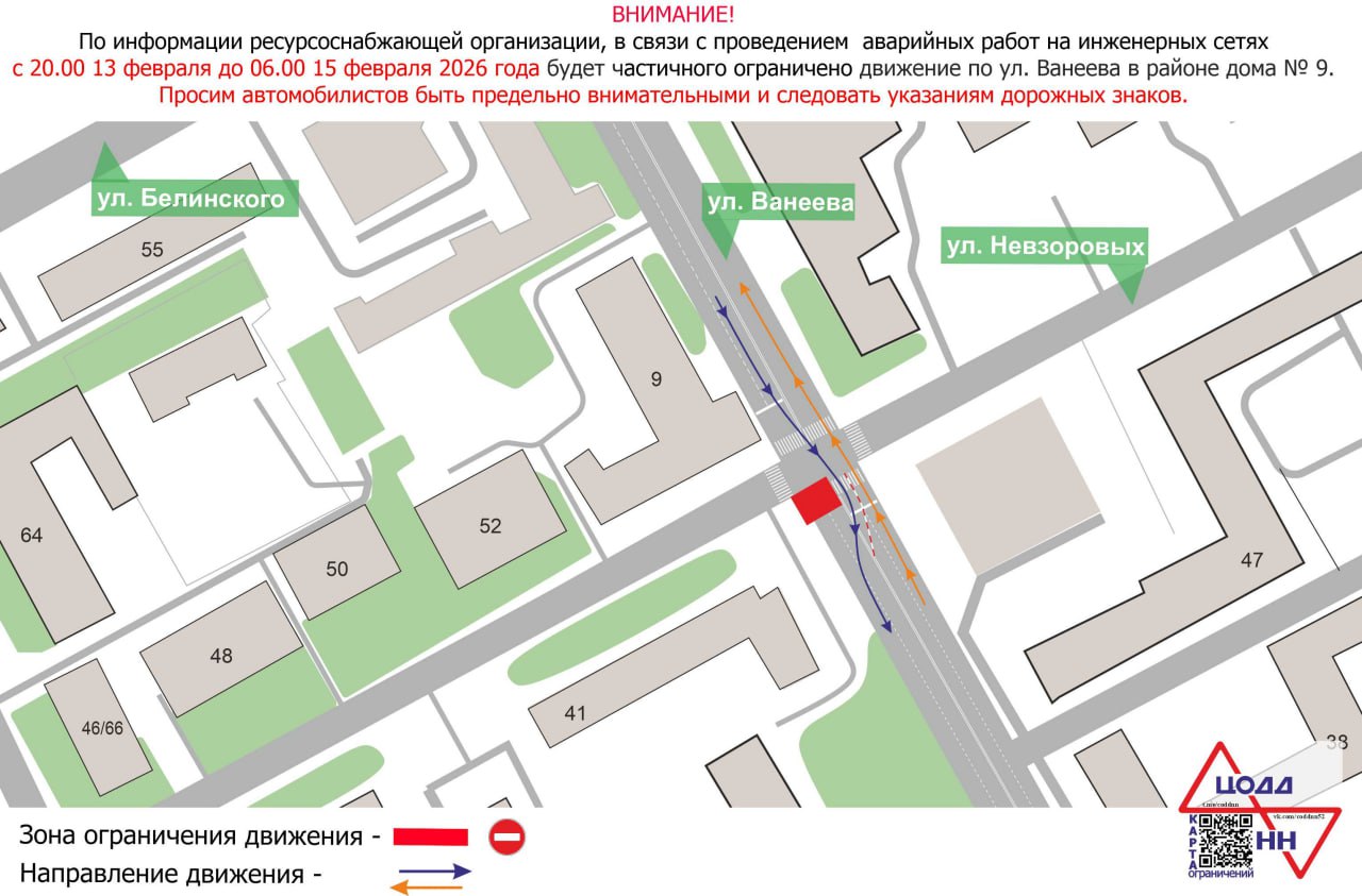 Также вечера 13 февраля будет ограничено движение на перекрестке Ванеева и Невзоровых. Общественный транспорт изменит маршруты.