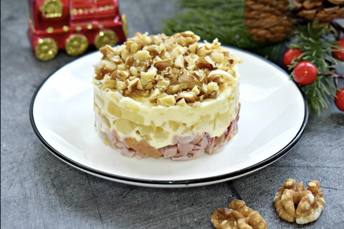 Следующий слой представляет собой нарезанные яйца с аналогичной «майонезной сеточкой» сверху. Затем идут ананасы, нарезанные кубиками, и снова майонез. На очереди тертый сыр, который также нужно покрыть небольшой сеткой майонеза. Финальный штрих — измельченные грецкие орехи. Примечание: на последнем слое майонезу места нет.