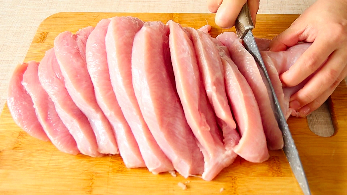 Для начала потребуется филе курицы или индейки, которое необходимо нарезать на пластинки.