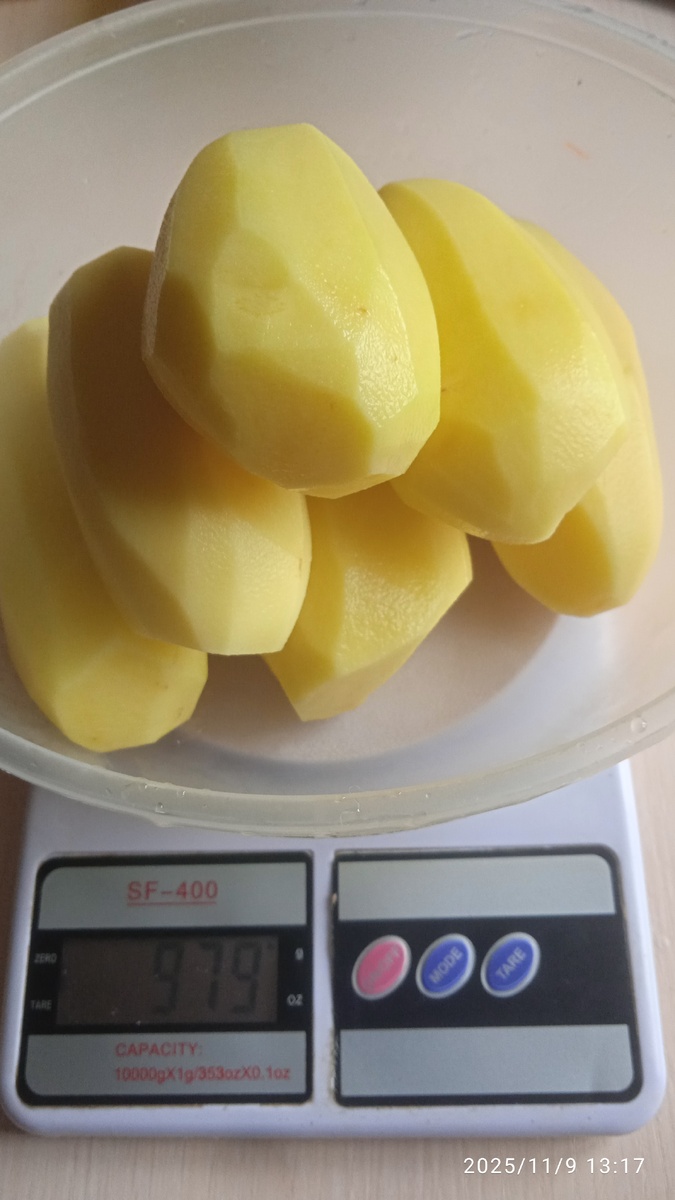 Почти килограмм картофеля был очищен и нарезан крупными кубиками. А для тех, кто предпочитает ещё больше — можно нарезать еще крупнее. После этого картошку бланшировали в кипящей воде с лавровым листом и уксусом (вместо лимонной кислоты), чтобы она сохранила свою текстуру и не развалилась при запекании.
