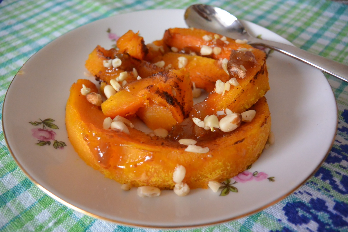 6. Как только тыква станет мягкой и золотистой, посыпаем ее кедровыми орешками. Для тех, кто любит сладкое, можно добавить немного варенья или меда.