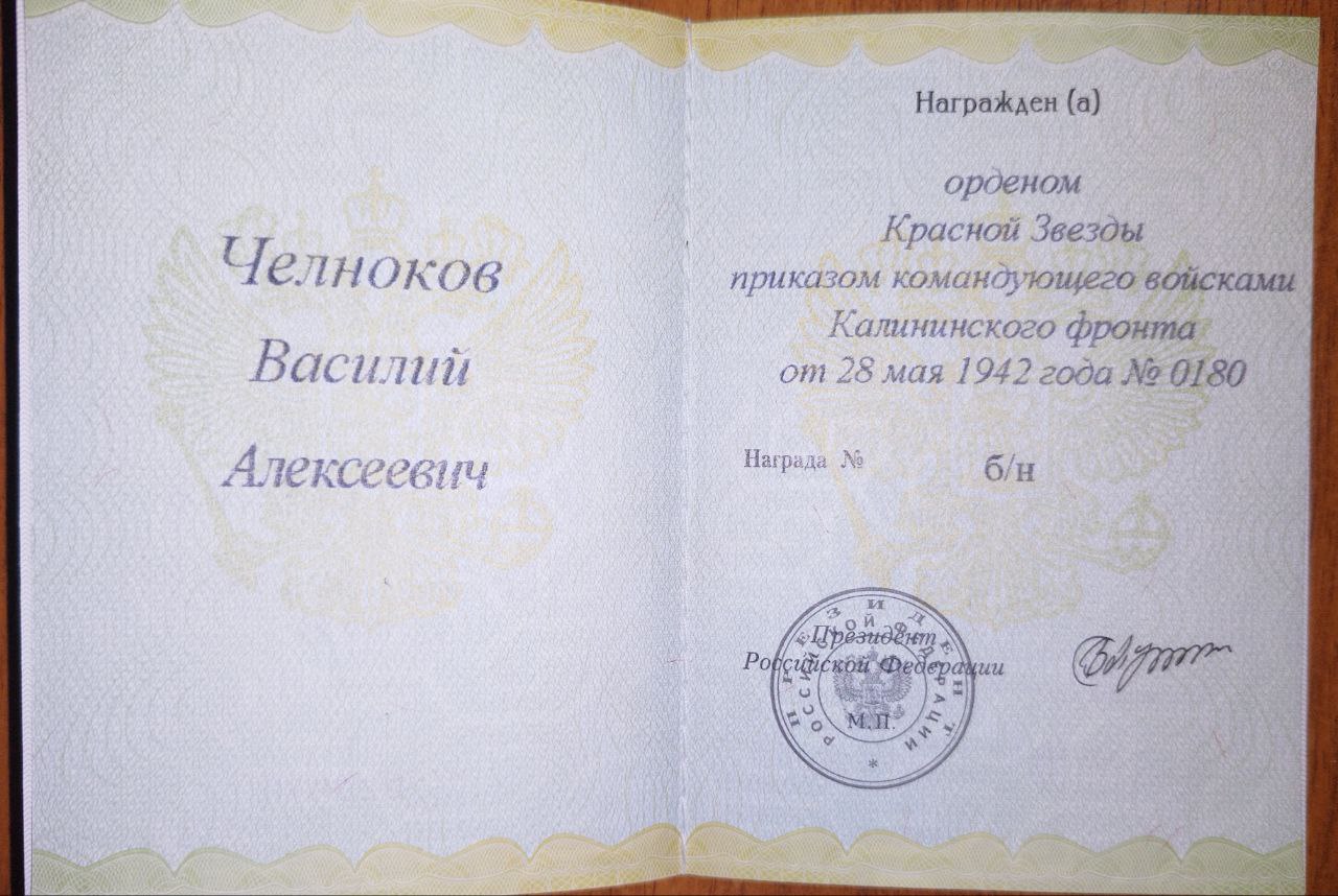В ведомстве ответили, что приказом командующего войсками Калининского фронта от 28 мая 1942 года №0180 красноармеец Челноков был представлен к награде, но в августе 1942 года в ходе боев погиб и считался пропавшим без вести. Только в 2024 году удалось установить личность героя и перезахоронить его в братской могиле в д. Веригино Зубцовского района Тверской области.