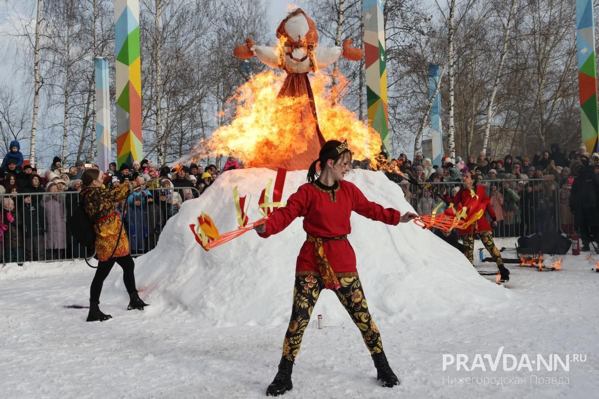 Эффектное сожжение Масленицы в Светлоярском парке Нижнего Новгорода.