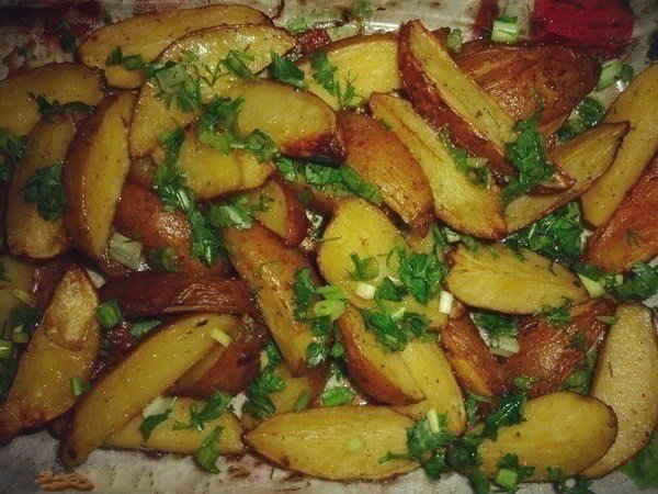 Запекание: Выложите картошку на заранее подготовленный противень, застеленный бумагой для выпечки. Немного посолите, но не увлекайтесь — соль добавим позднее. Поместите в разогретую духовку и запекайте до готовности.