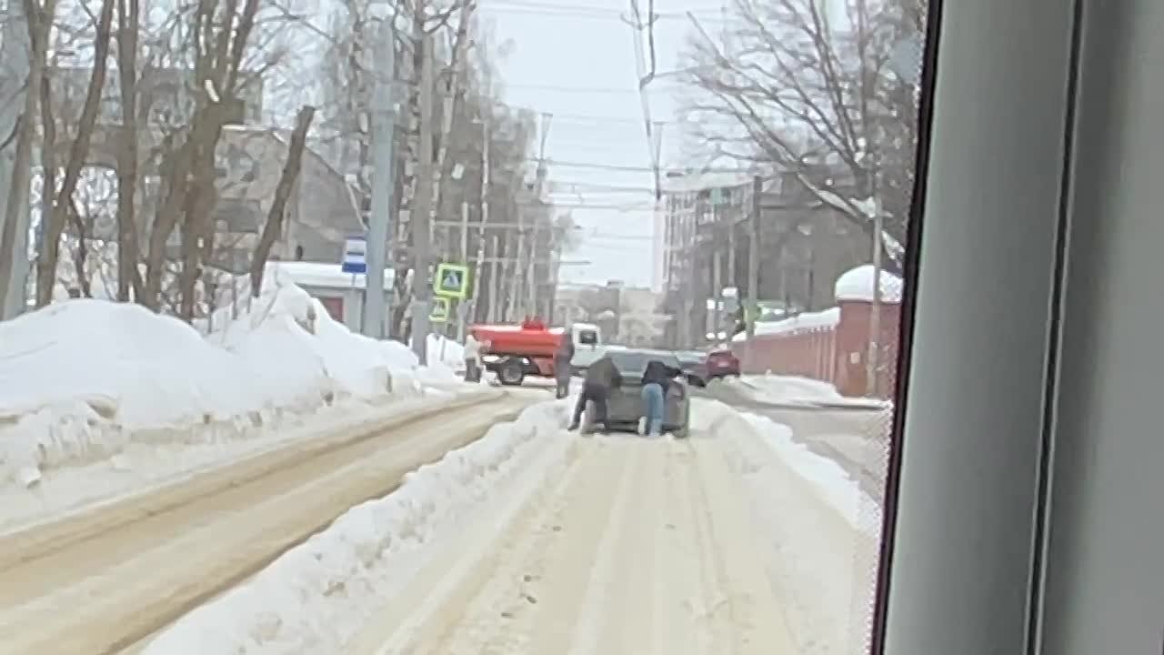 Иномарка хотела сократить путь и застряла на трамвайных путях на улице Пушкина в Нижнем Новгороде