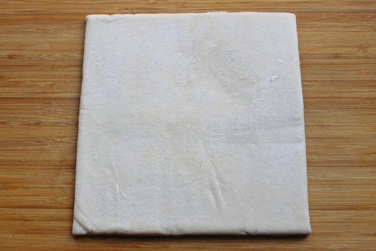 Когда все основные компоненты готовы, раскатываем слоеное тесто, предварительно присыпав пергаментную бумагу мукой, чтобы избежать прилипания. Тесто разделяем на равные части и формируем небольшие углубления.