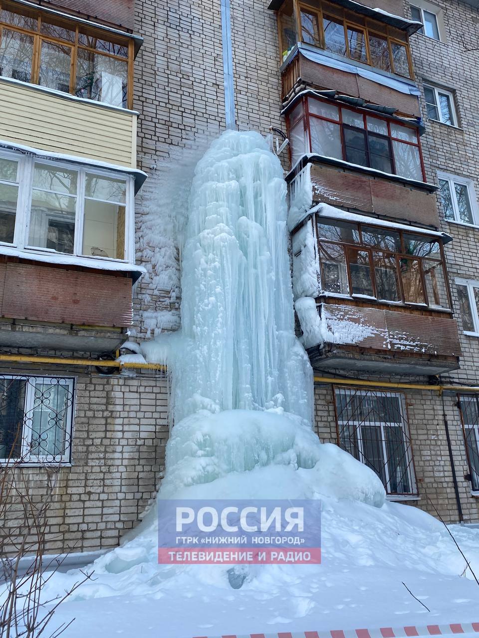 Гигантская глыба льда образовалась на фасаде дома №1 на улице Кудьминской в Нижнем Новгороде