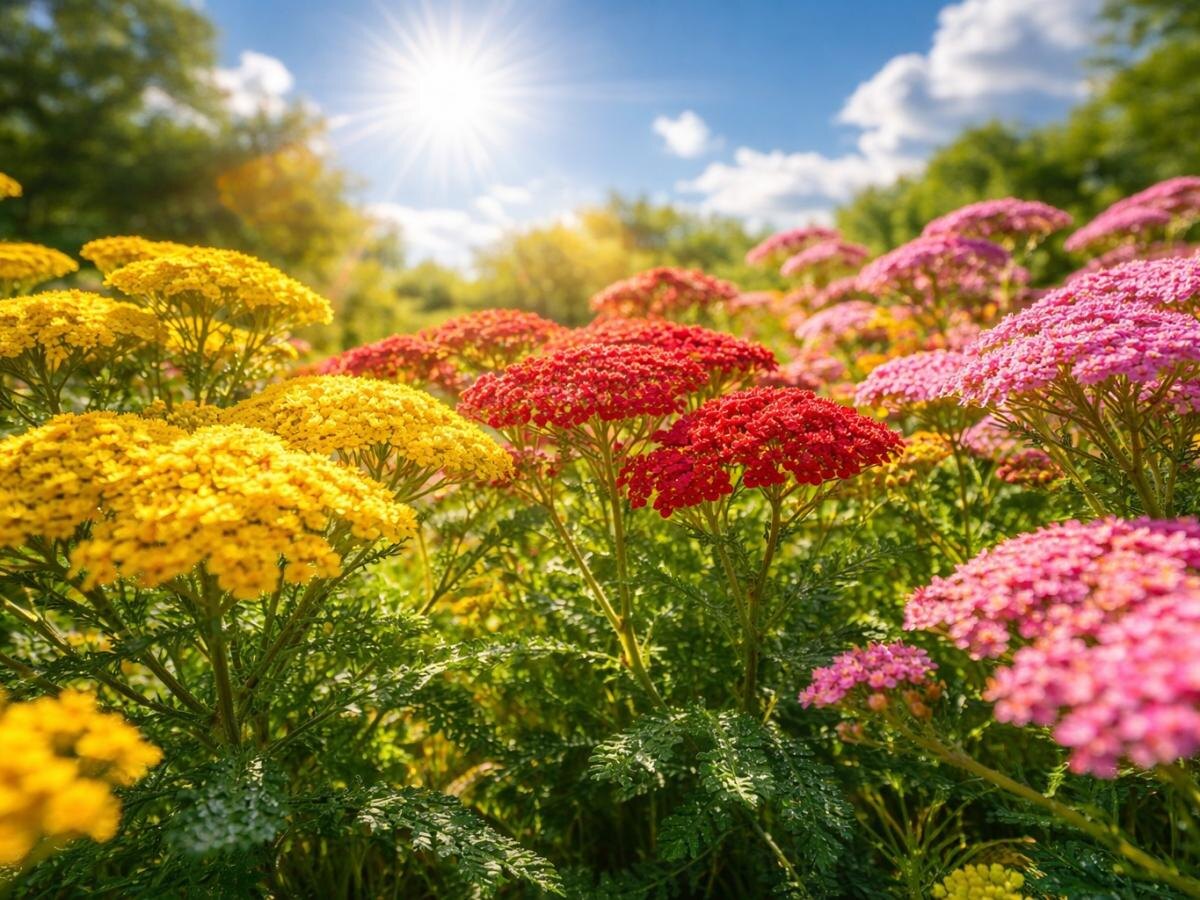 При посадке в солнечном месте, тысячелистник активно разрастается, образуя пышные соцветия, которые могут быть белыми, жёлтыми, розовыми или красными в зависимости от сорта. Цветение продолжается все летние месяцы, а аккуратные кустики гармонично смотрятся как в одиночных посадках, так и в цветниках и миксбордерах.