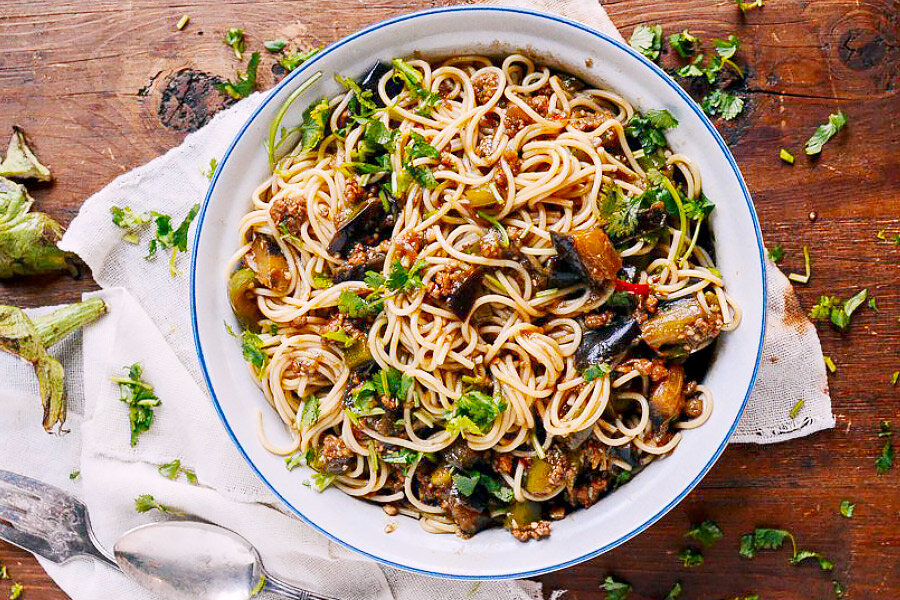 Нарезанные баклажаны замочить в подсоленной воде на 10-15 минут. Это поможет избежать излишнего впитывания масла. После этого отжать их.Измельчить имбирь и чеснок, а также нарезать болгарский и чили перцы.Фарш смешать с шаосинским вином, черным перцем, частью светлого соевого соуса, кунжутным маслом, кукурузным крахмалом и водой, оставить мариноваться.Отварить лапшу согласно инструкции и отложить.На разогретой сковороде обжарить болгарский перец, затем убрать его на тарелку.Добавить оставшееся растительное масло, обжарить имбирь и чеснок до появления аромата, затем добавить чили.Увеличить огонь и добавить фарш. Когда он зарумянится, добавить баклажаны и тщательно перемешать.Посолить, добавить соусы и бульон. Накрыть крышкой и тушить 15 минут до мягкости баклажанов. Обратите внимание на консистенцию соуса.Вернуть на сковороду болгарский перец, добавить лапшу и кинзу, перемешать. По желанию подать сразу!Приятного аппетита!