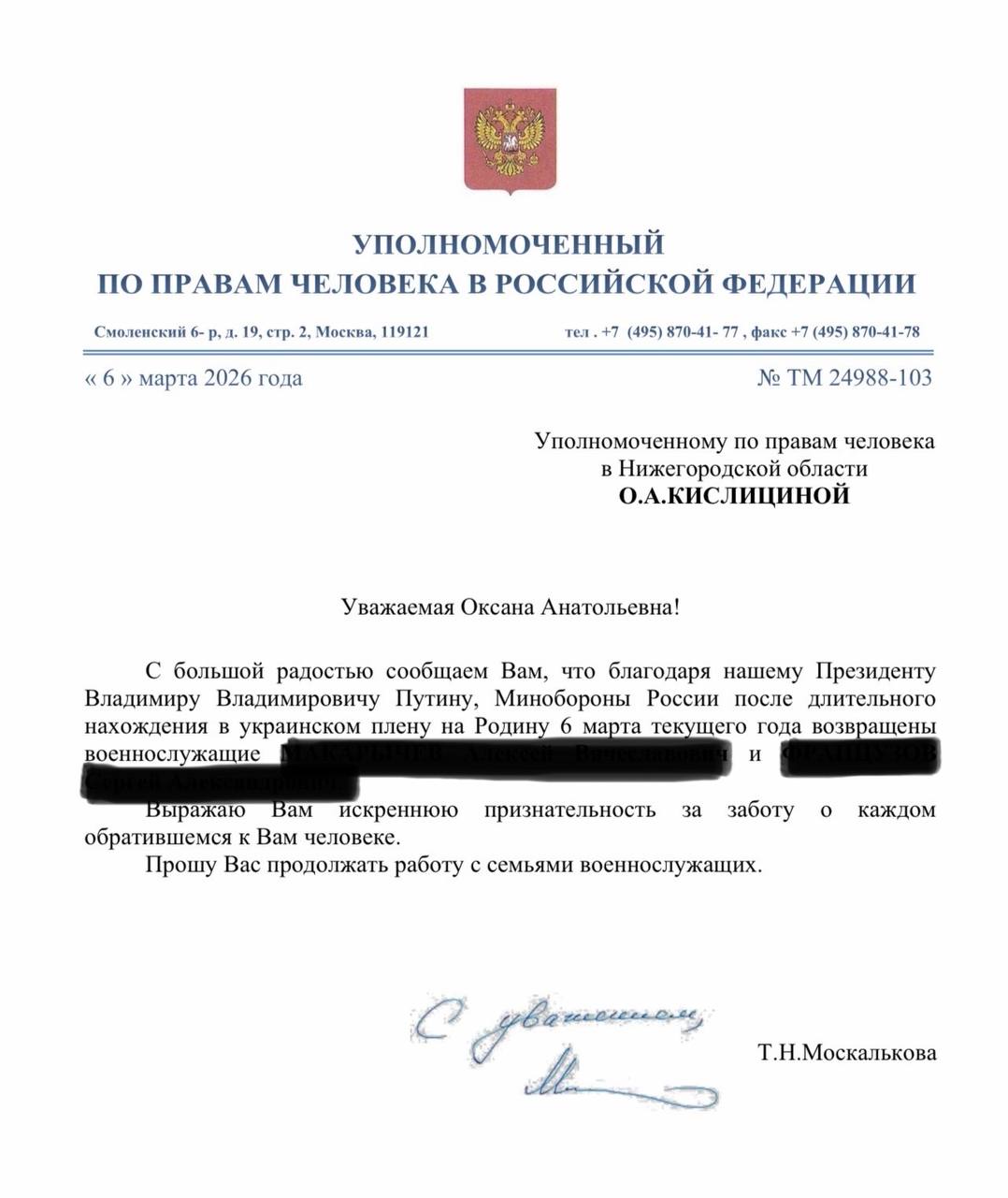 Двое нижегородских бойцов вернулись из украинского плена в результате обмена, сообщила Уполномоченный по правам человека в Нижегородской области Оксана Кислицына
