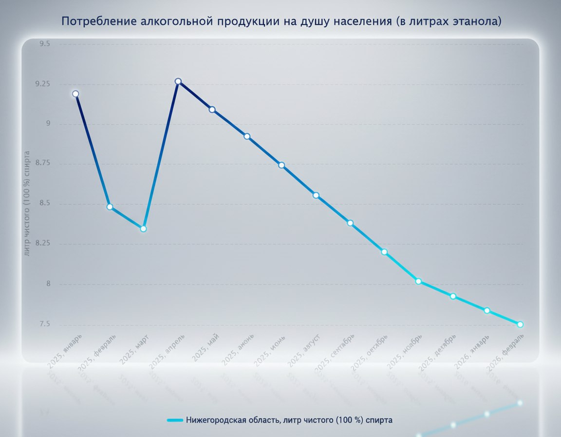 Нижегородская область побила свой же рекорд сокращения потребления алкогольной продукции: в январе 2025 года это было 9,18 литров этанола на душу населения, к февралю 2026-го показатель рухнул до 7,75 литров.