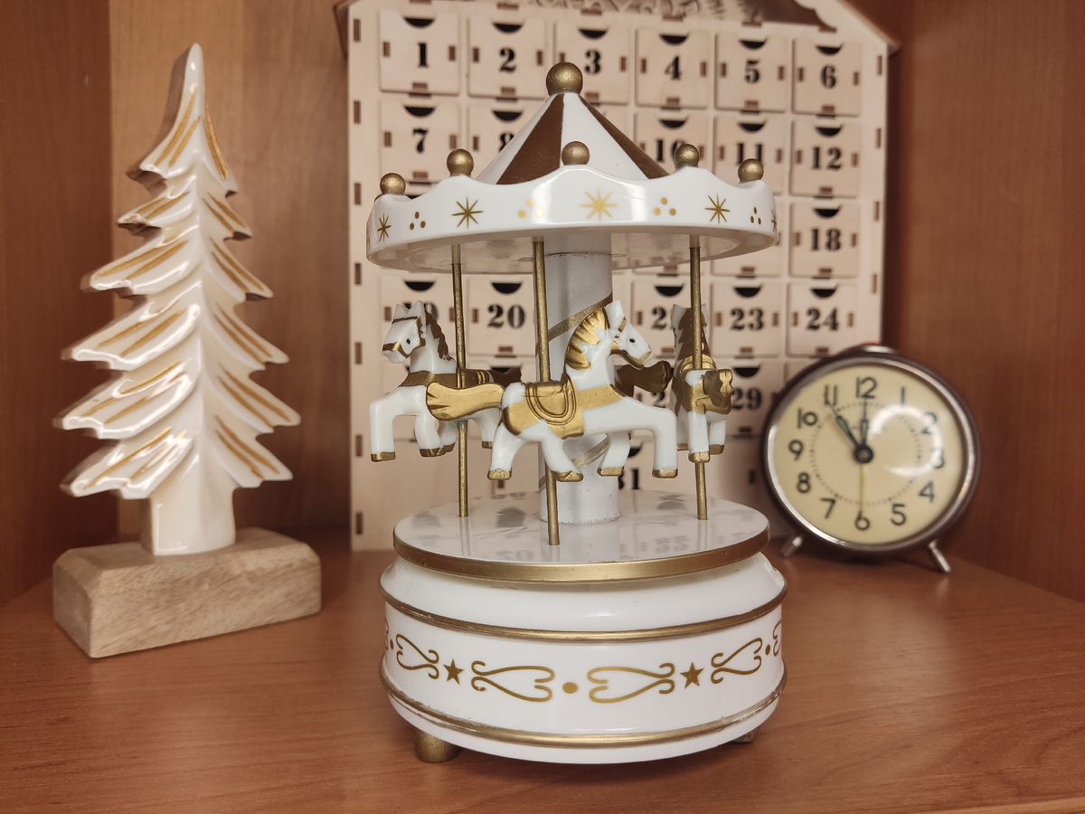 - Карусель для декора: Бело-золотая карусель, которая создает атмосферу детства и ностальгии. Она наполняет пространство мелодией, что привлекает внимание как детей, так и взрослых.
