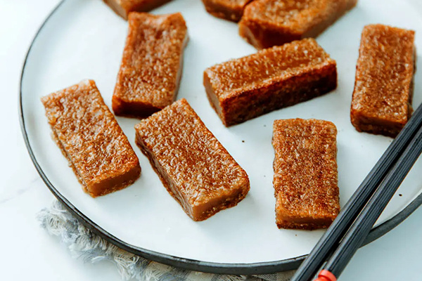 - Темный Нянь Гао — сладкий по вкусу, подают как десерт, обычно нарезанным и обжаренным.