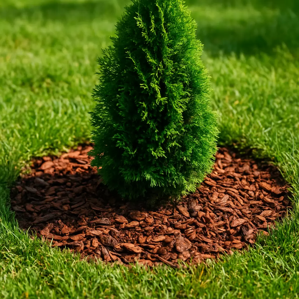 - Хвойных деревьев (ель, туя, сосна), где мульча образует натуральный слой подстилки.