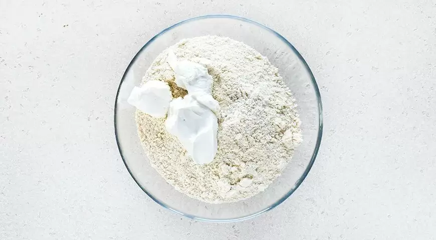 2. Когда масло и мука образуют крошку, добавляем сметану. Вымешиваем тесто до получения однородной массы и плотной консистенции. Делим тесто на 4 равные части, формируем из них шарики и заворачиваем в пленку. Убираем в холодильник на полчаса — это обязательно для лучшей текстуры теста.