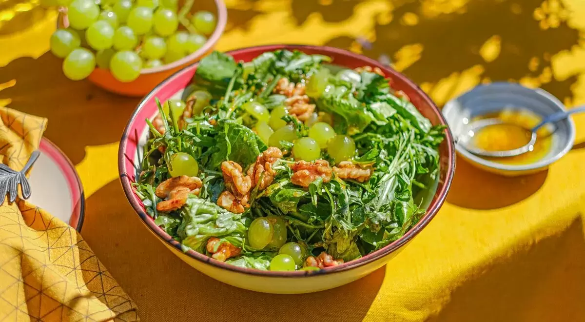 Виноград прекрасно сочетается с разными овощами и зеленью. Например, зелёный салат с виноградом включает листья романо и руколу, а также хрустящие грецкие орехи. Заправка из меда и горчицы придает этому блюду неповторимый вкус. В качестве дополнения можно использовать любой сыр.