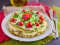 3. Приготовление начинки: Для наземления необходимо соединить две вареные яйца, измельченный чеснок, 1 столовую ложку майонеза, а также посолите и поперчите по вкусу. На остывший блинчик намазать половину начинки, накрыть вторым блинчиком и повторить процесс, завершая третий блин майонезом. Украсить торт свежей рукколой и разрезанными помидорами черри для презентации.