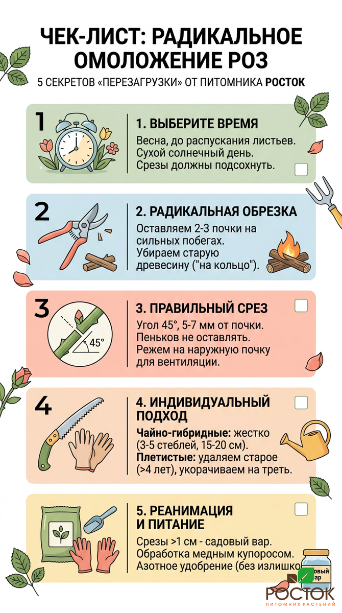 Основное правило здесь — время. Лучший период для обрезки роз — ранняя весна. Почки должны быть уже заметными, но листья еще не раскрылись. Важно выбрать солнечный, сухой день, чтобы свежие срезы могли быстро подсохнуть. Это защитит от инфекций.