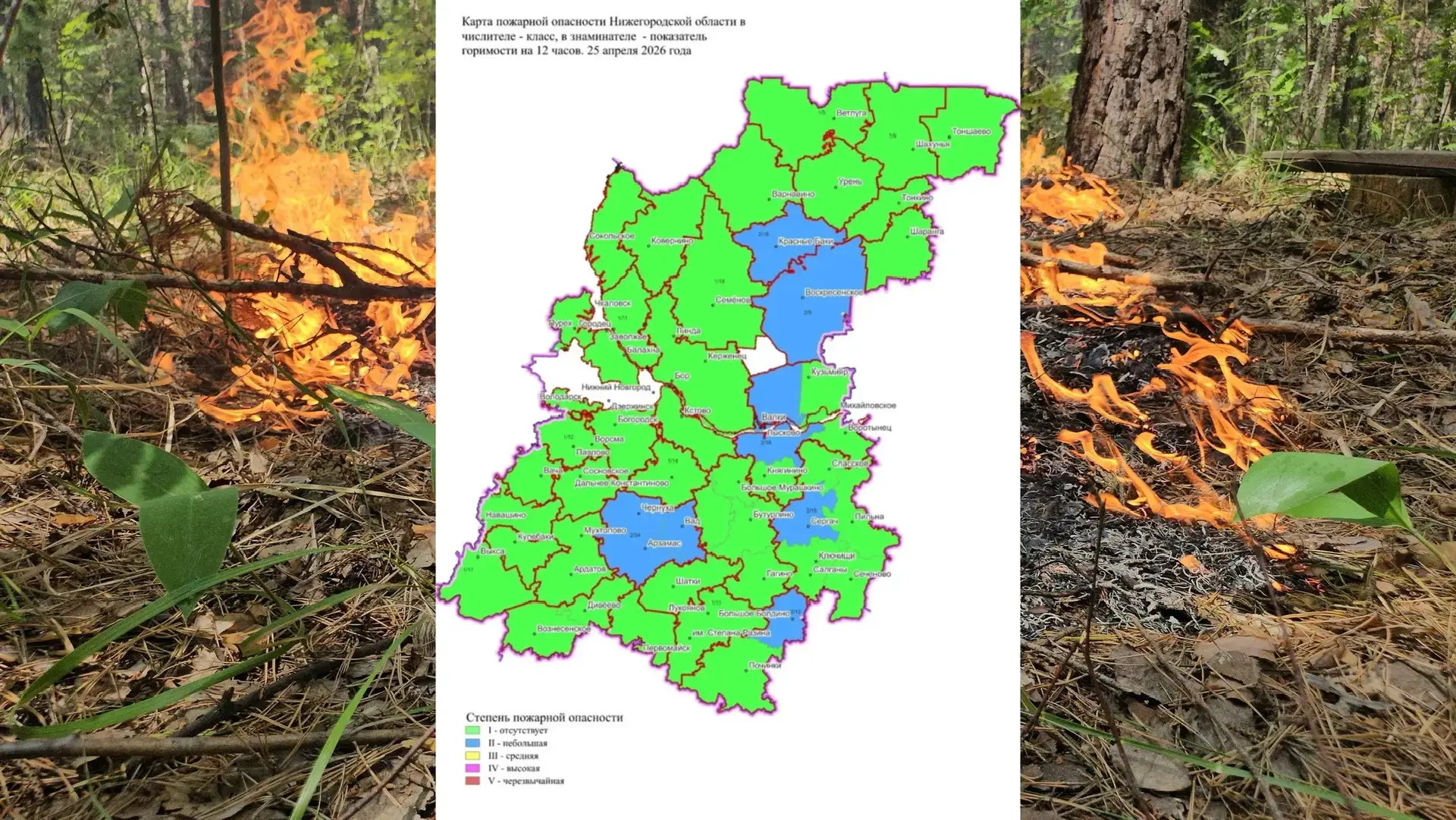 Лишь в 7 округах (Краснобаковский, Воскресенский, Лысковский, г. о. г. Арзамас, Вадский, Сергачский и Большеболдинский) отмечен 2 й класс — всё ещё невысокий риск возгораний.