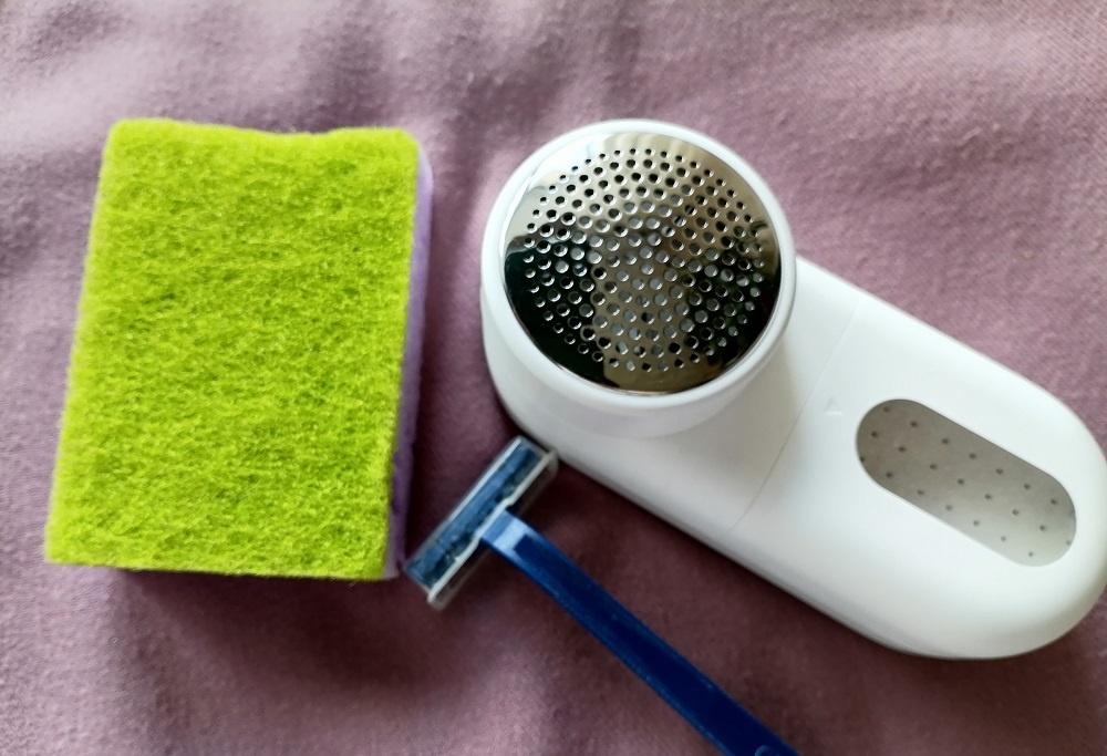 - Абразивная губка. Новая губка для посуды с шершавой стороной может полностью заменить скребок для катышков. Легкие круговые движения помогут быстро убрать лишний ворс.