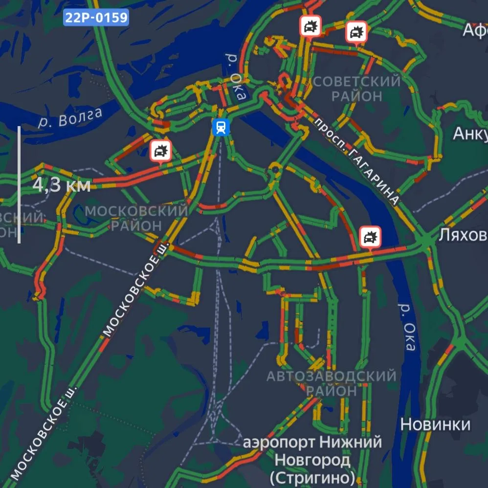 Этого следовало ожидать, но вы всё равно поехали. Нижний погряз в предпраздничных пробках. Сейчас уже 9 баллов.