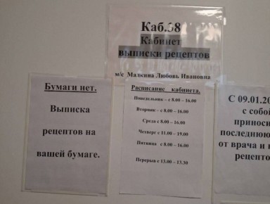 Оказывается, деньги на бумагу есть.В местном Минздраве сообщили, что бюджеты на канцтовары для ЦРБ были выделены. Инициативу проявила одна из медсестёр и, потратив целый лист, накатала мэсседж для пациентов. Только спросить не удалось, но...