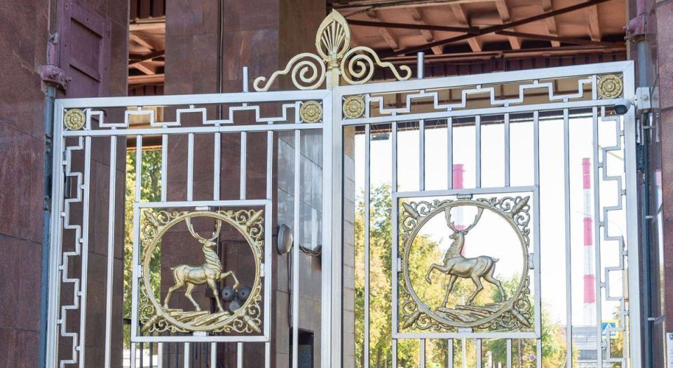 Кованые ворота отправили на производственную площадку. Каждую секцию ворот очистили, далее они прошли несколько этапов подготовки и нанесения специального покрытия, а затем их покрыли эмалью и лаком.Оленей раскрасили вручную. Теперь золотистые фигурки...